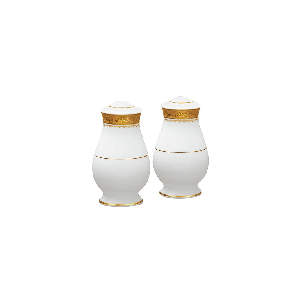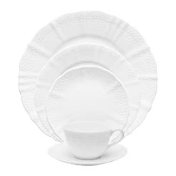 This stunning pattern from Noritake features a wide, etched gold band, with an inner band of delicate white florals highlighted by a subtle grey.