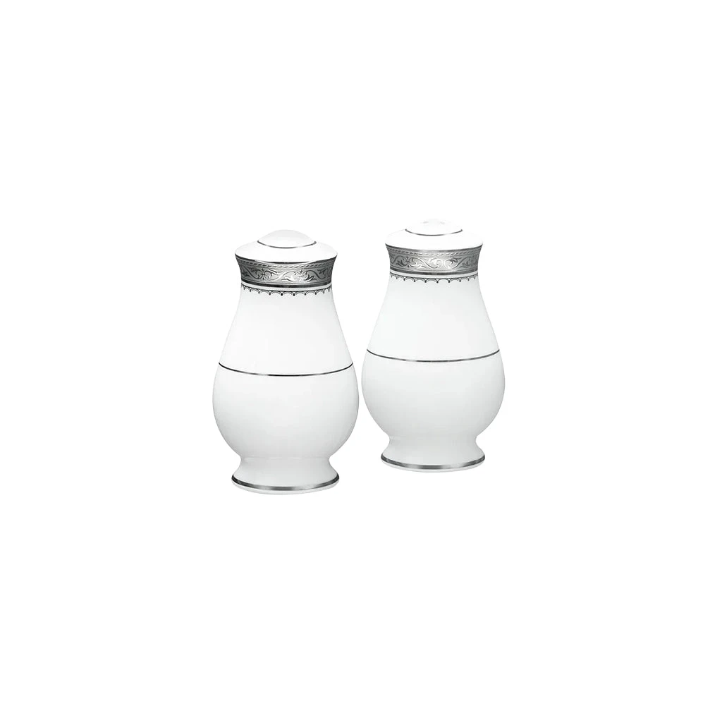 Noritake Odessa Platinum dinnerware, a masterpiece of Japanese artistry, features a wide, etched platinum band, with an inner band with ethereal white blossoms, painted upon dove grey.