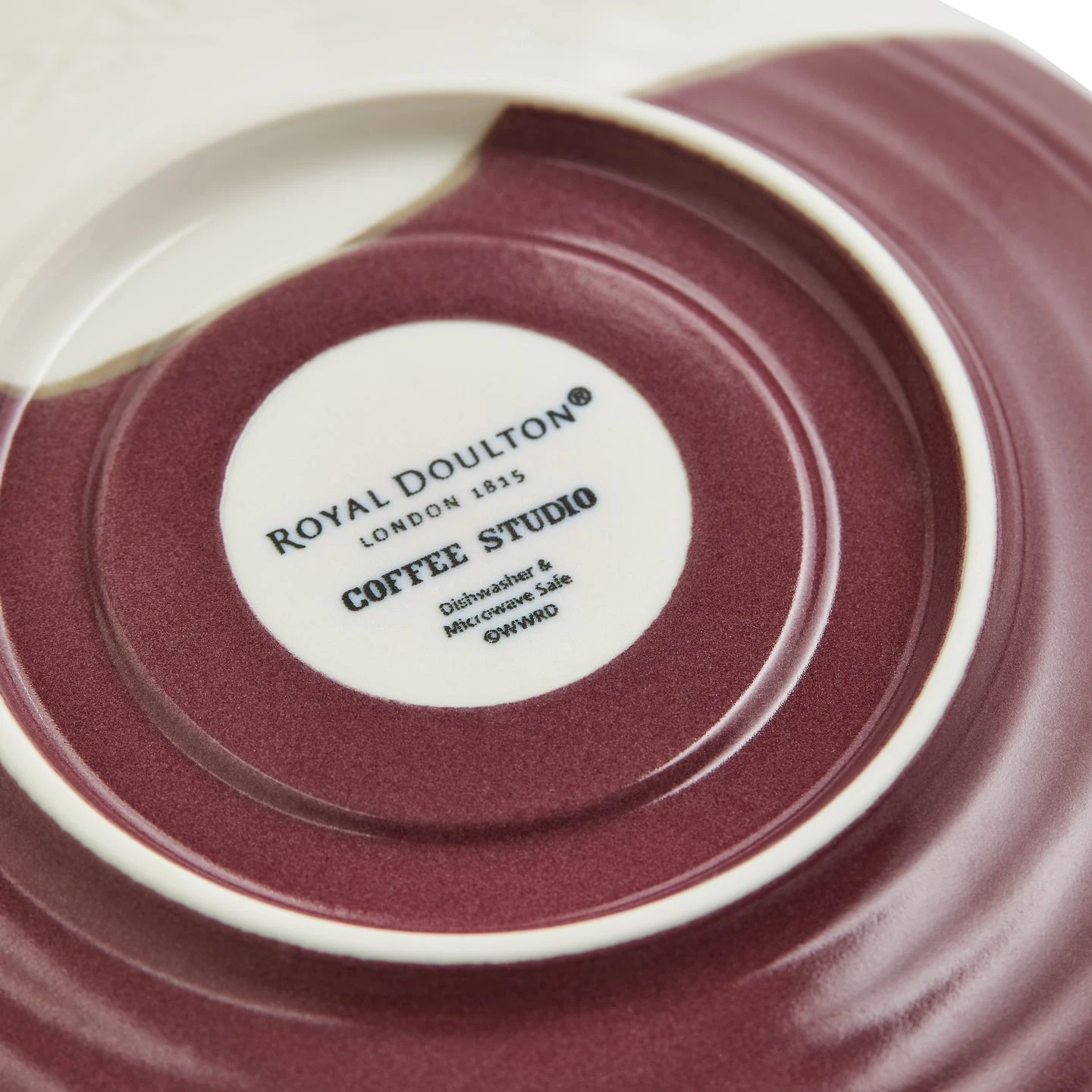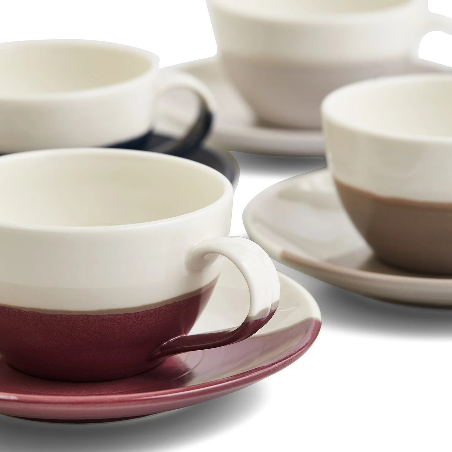 Serve your favourite coffee in this stylish set of four Coffee Studio Flat White Cups & Saucers. The perfect size for this popular mix of espresso with velvety microfoam in mind, the four contemporary colours of dark grey, dark blue, plum and grey in satin, double dipped glazes make this set unique and versatile. Crafted from chip-resistant porcelain, each piece gives a nod to our heritage of half-dipped salt glaze designs. Presented in a kraft display gift box, theyÕre the ideal gift for a coffee aficionado.