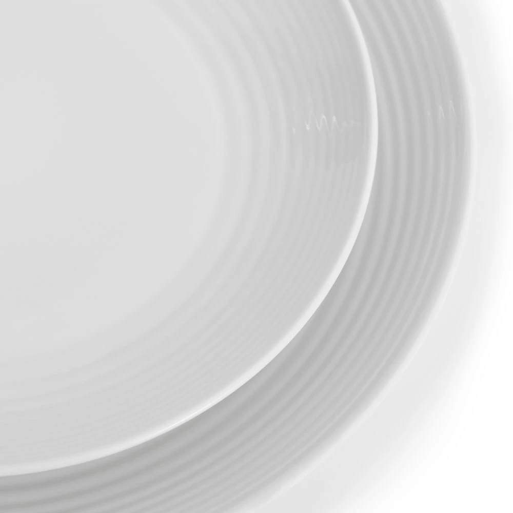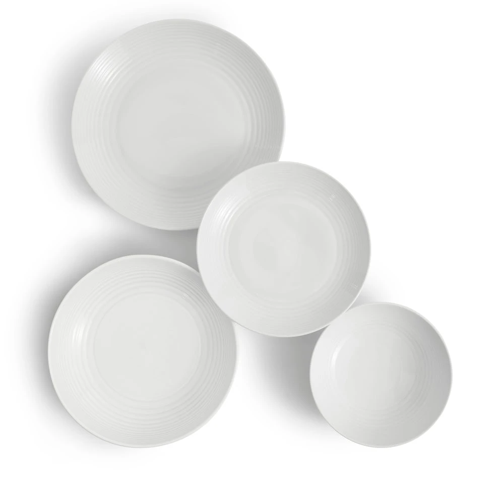 Transform everyday dining with this Gordon Ramsay Maze 16 Piece Dinner Set in White. Made from durable stoneware, this white dinner set includes four dinner plates, four side plates, four cereal bowls and four mugs. Developed in partnership with Gordon Ramsay this classic colourway works effortlessly with other colours in the range to create a cool and casual dining experience. With its clean lines and versatility, the Maze collection is tough enough for everyday use and features an embossed circular pattern for a hand-made feel, drawing your eye to the wonderful food being served in your home.