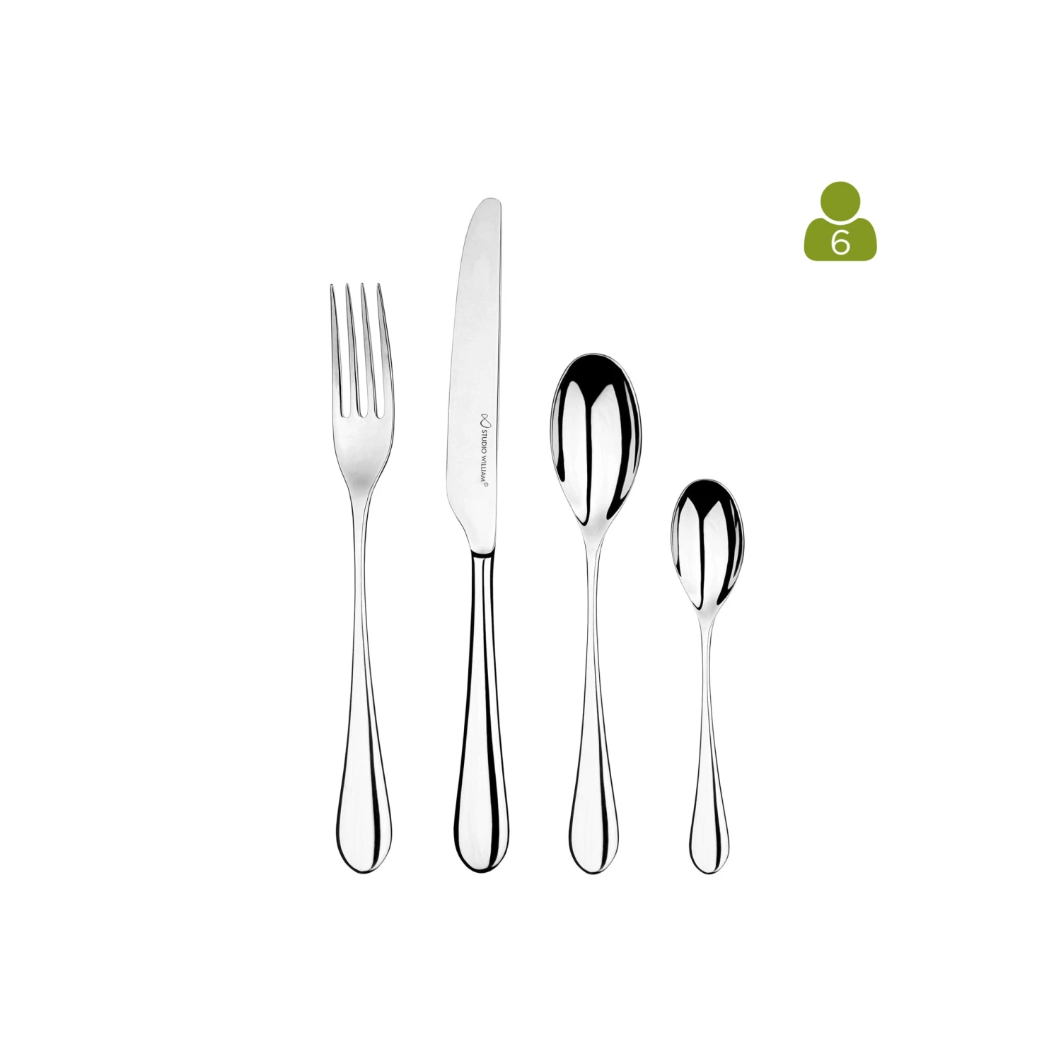 Mulberry Mirror 24 Piece consists of 6 of the Table Knife, Table Fork, Dessert Spoon and an English Teaspoon. Our Mulberry cutlery is made using the finest quality 18/10 stainless steel and is available in mirror finish or in a silver-plated version. Metal Thickness of 5.3mm.