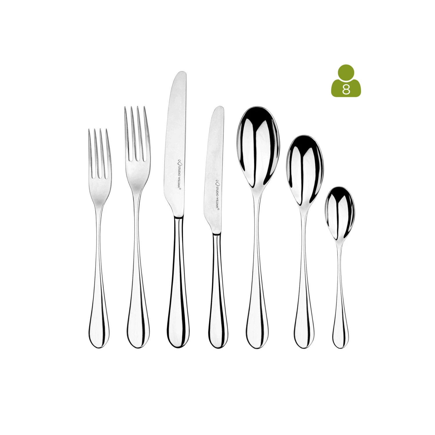 Mulberry Mirror 56 Piece Set consists of 8 x 7 piece place settings (Table Knife, Table Fork, Soup Spoon, Side Knife, Side Fork, Dessert Spoon and a English Teaspoon)