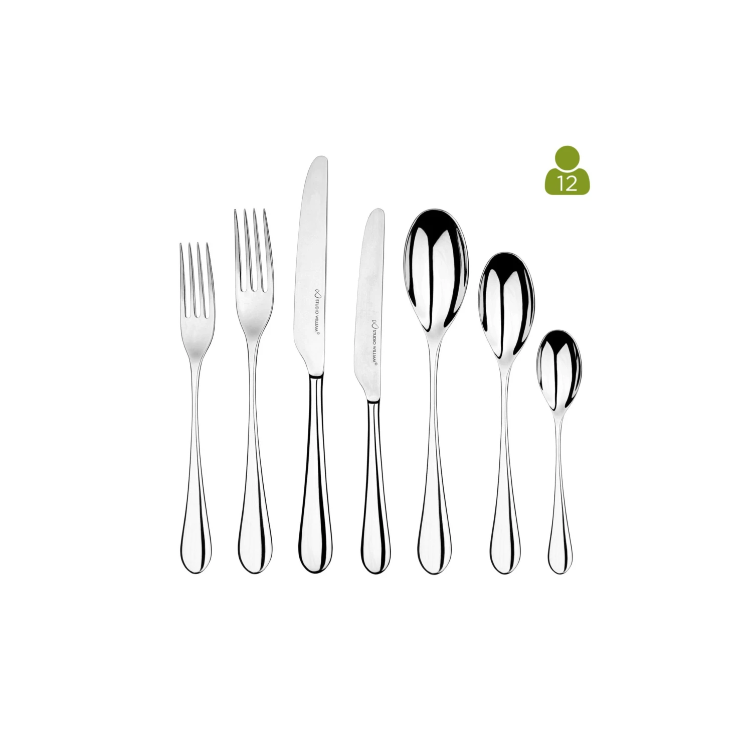 Mulberry Mirror 84 Piece Set consists of 12 x 7 piece place settings (Table Knife, Table Fork, Soup Spoon, Side Knife, Side Fork, Dessert Spoon and a English Teaspoon)