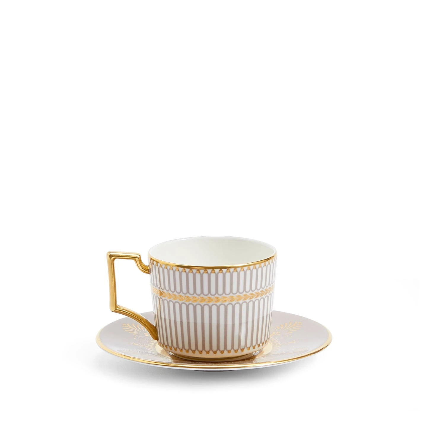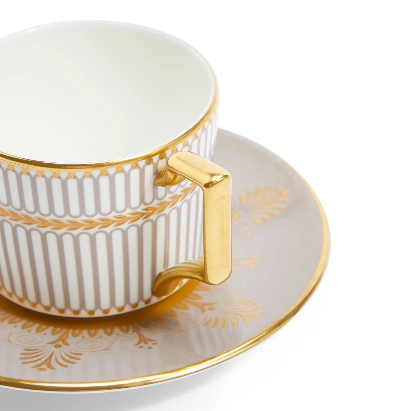 The saucer is adorned with refined neoclassical motifs and golden palmettes, while both pieces are finished in England with luxurious 22-carat gold detailing—perfect for adding elegance to your espresso ritual.
