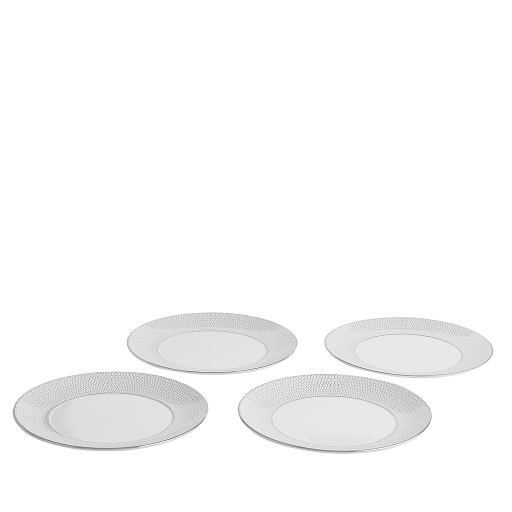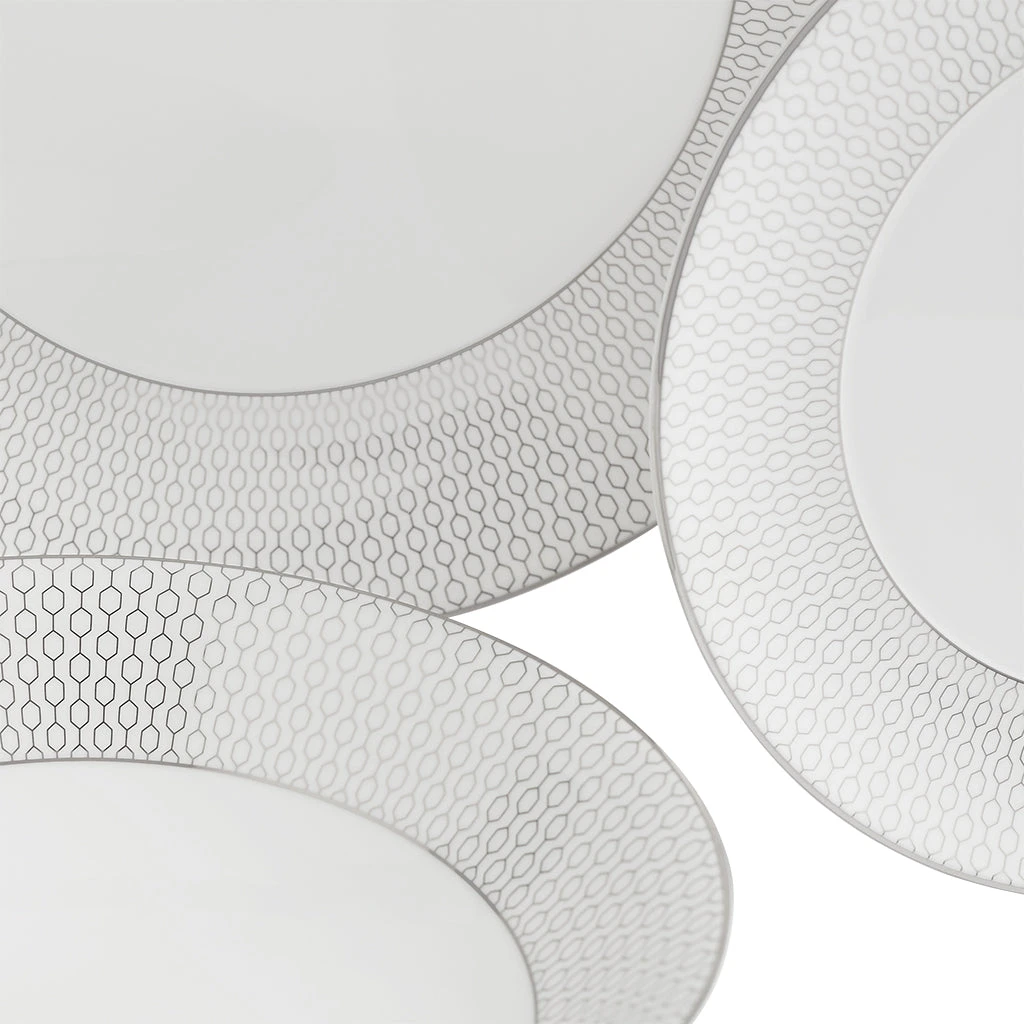 A metallic platinum silver geometric chain link decoration on fine white bone china, feels slightly raised and textured.