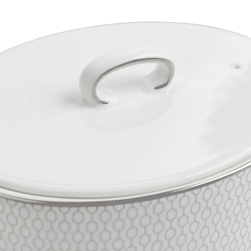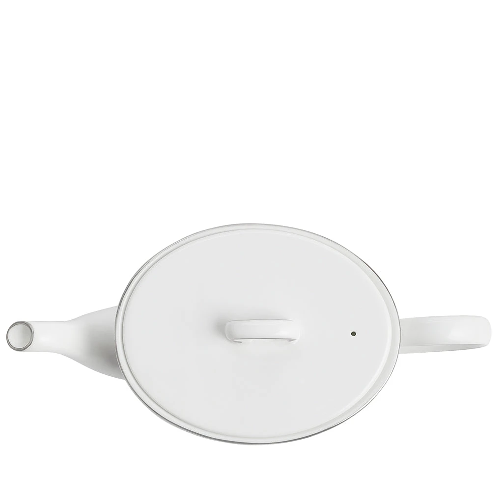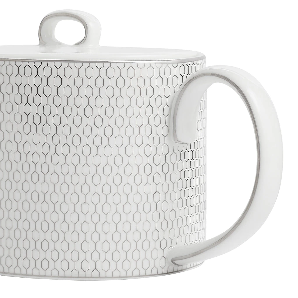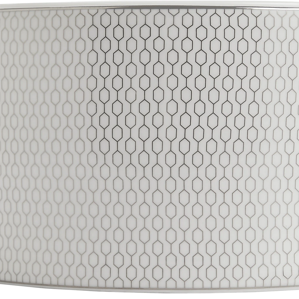 A metallic platinum silver geometric chain link decoration on fine white bone china, feels slightly raised and textured.